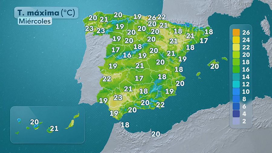 El mapa térmico de este miércoles mostrará una tendencia a la baja en las temperaturas máximas en las islas Canarias occidentales y en la mayor parte de la Península, con la excepción del tercio nordeste, donde habrá pocos cambios, y las zonas del Estrecho y Alborán, donde se esperan ligeros aumentos.