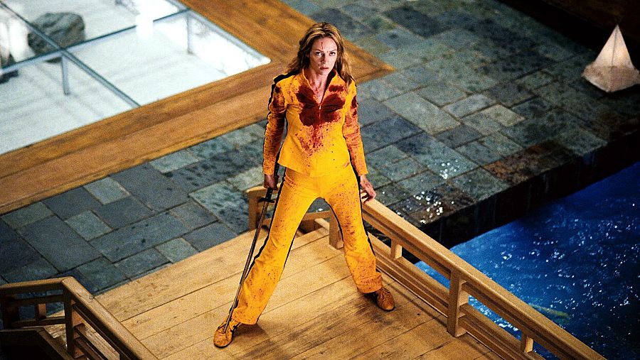 Uma Thurman en Kill Bill, con el icónico traje amarillo manchado de sangre tras una intensa escena de acción.