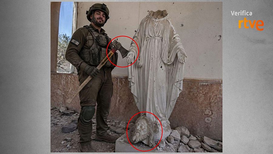 En redes sociales difunden una fotografía de un hombre con uniforme militar junto a una estatua sin cabeza y aseguran que es un soldado israelí después de haber decapitado una estatua de Cristo. Los mensajes que comparten la instantánea la presentan como si se tratara de un nuevo ataque israelí a símbolos religiosos tras la destrucción de una talla de Cristo en Líbano. No es una imagen real, está creada con inteligencia artificial.