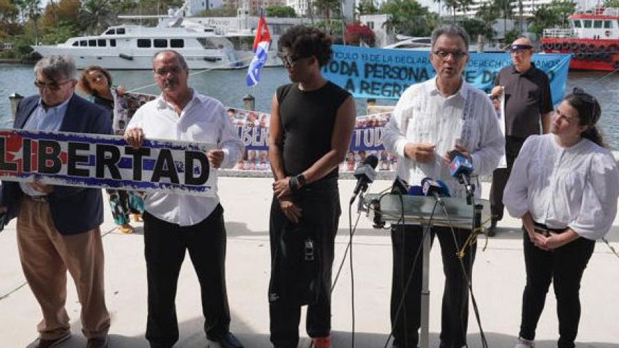 Santiago Alpizar, a la izquierda, junto a otros cubanos en el exilio el pasado 16 de marzo en una comparecencia para solicitar a Trump que les permita enviar un barco desde Florida con ayuda humanitaria para los opositores dentro de la isla EFE/ Alberto Boal