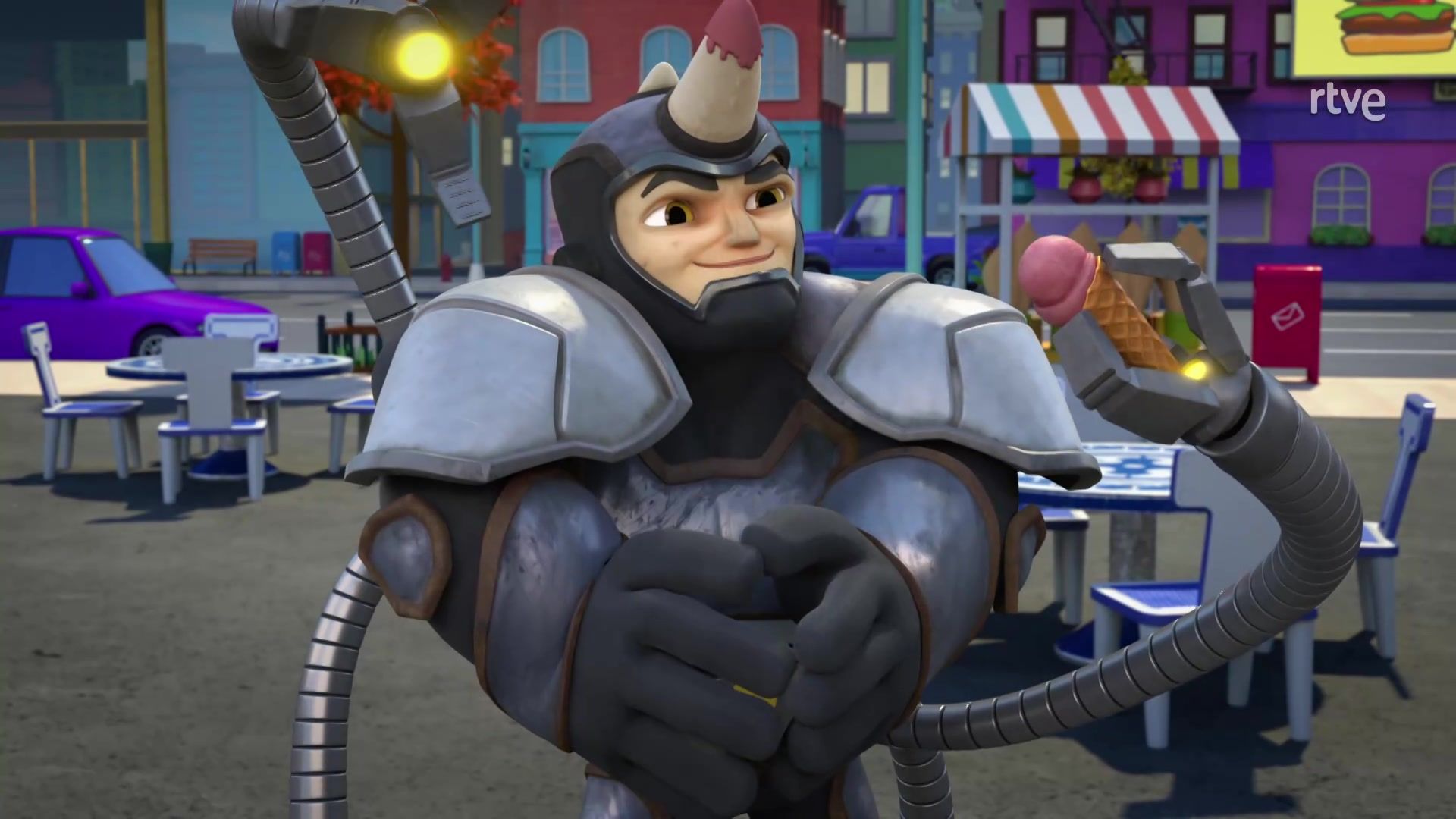 Frustrada tras haber sido detenida por el superequipo, Doc Ock se desprende de su traje de tentáculos. Rhino lo recoge y toma su lugar.