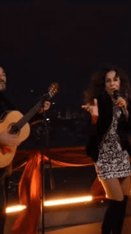 Desde lo más alto del Pirulí, Rosario Flores y su hijo Pedro Antonio Lazaga, acompañados de Antonio y Josemi Carmona de Ketama, interpretan "De ley"