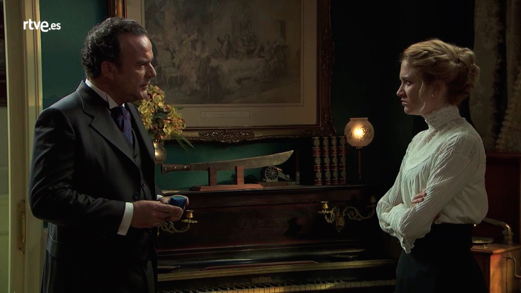 Después de evitar que el comisario detenga a Don Ramón, Elvira regresa a su casa con el Coronel. Don Arturo le habla mal de Simón y su traición, queriéndole poner en contra del joven. Le regala un anillo con la flor de lis, que significa la lealtad, para que a partir de ahora haga lo que él quiera.