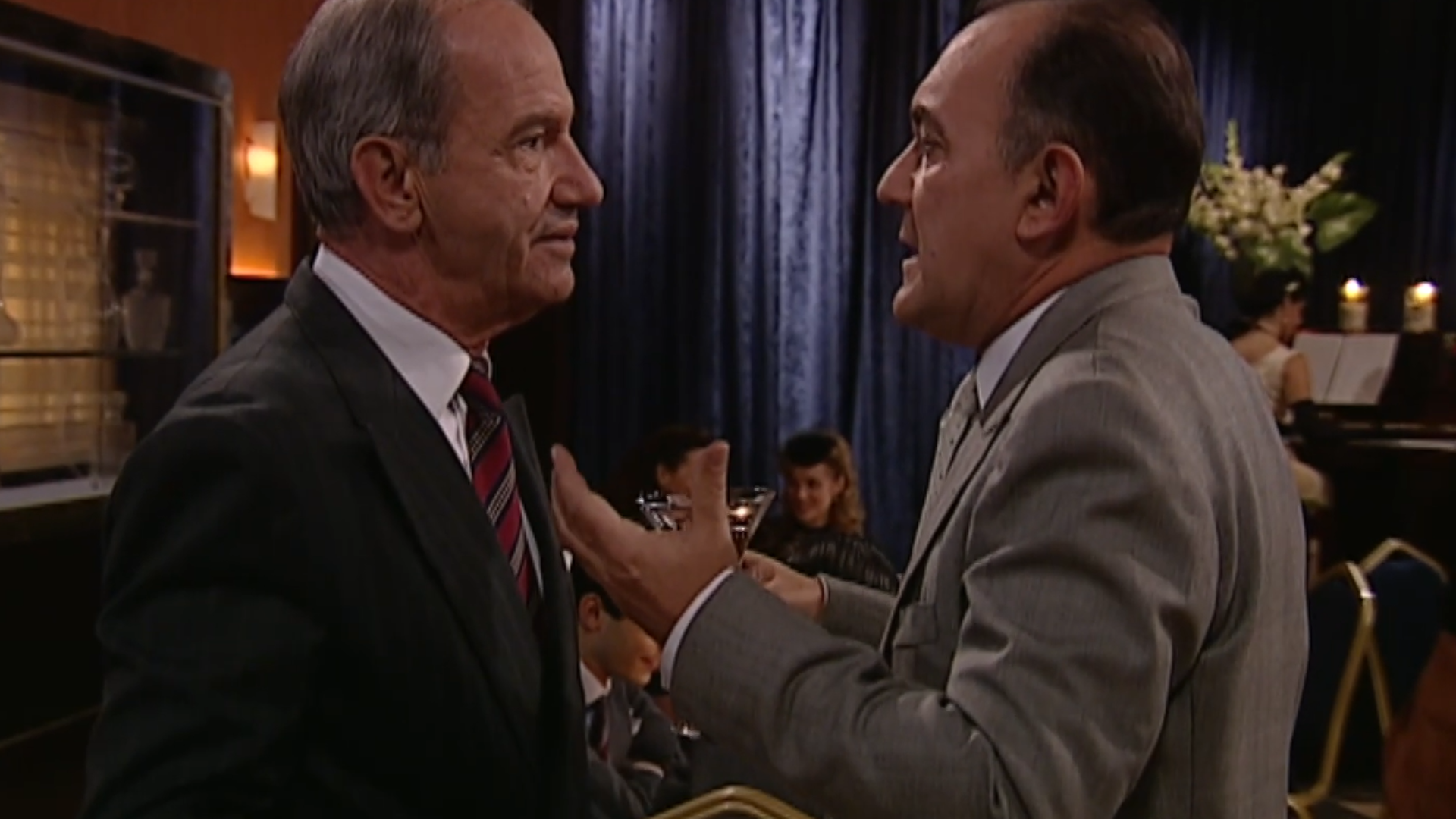 En la cena familiar, Amador, conteniendo a duras penas la rabia, intenta menoscabar la imagen de Paloma, pero sin éxito. Ella cae en gracia a Clarisa, y es Amador quien sufre los reproches de su padre. Angustias, en su delirio, confunde a Carlota con Elisa, y le insiste en que haga que 'su hermana' se case con Matías, que es su única opción. Carlota, dolida, jura que nunca se dejará tocar por un hombre. Florita teme que sus compañeros desvelen el paradero de Carlos. Su angustia crece cuando esa noche Carlos no aparece. Sito se va de juerga con dos muchachos ligeros de cascos, pero Inés le estropea la noche reprochándole su actitud díscola, y prohibiéndole entrar en casa. Borracho y desconcertado, Sito pide ayuda a Ángel.