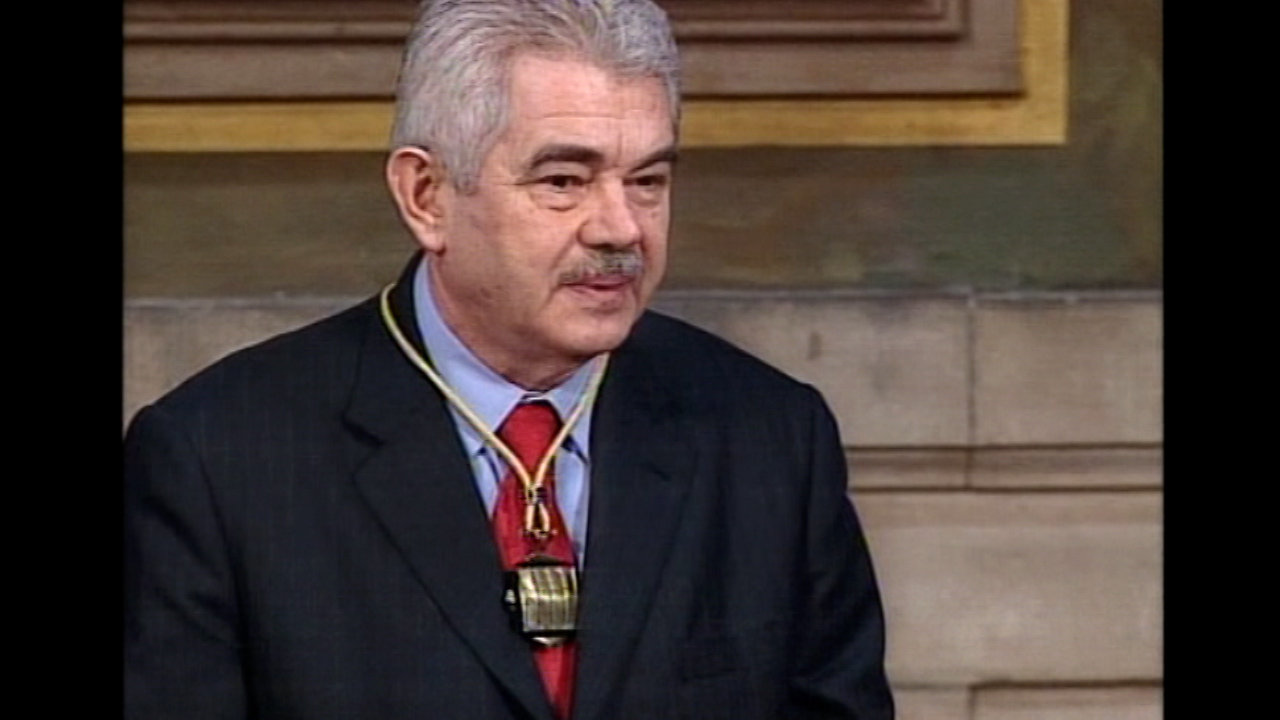Pasqual Maragall s'adreça als convidats i autoritats del Saló Sant Jordi del Palau de la Generalitat en el seu primer discurs després de la presa...