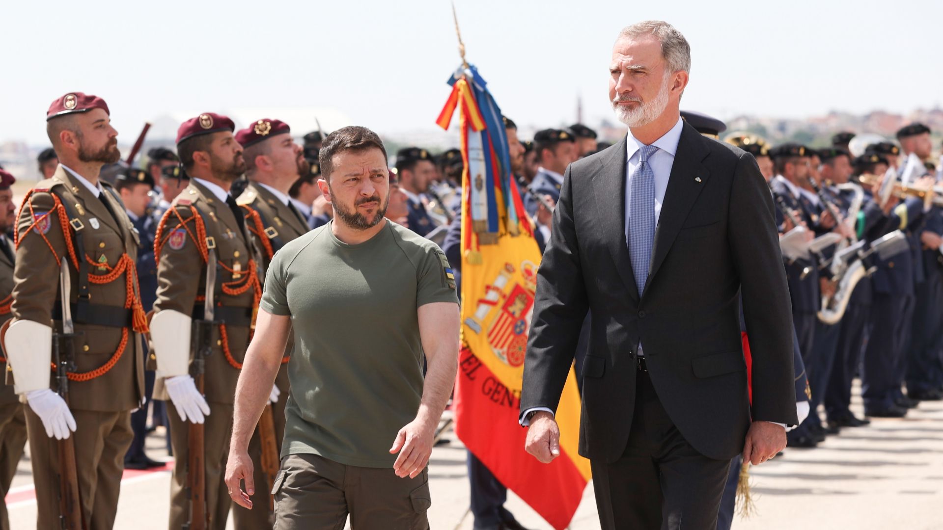 El Rey recibió a pie de pista, en Barajas, al presidente Zelenski, en su primera visita oficial a España, en la que firmó un acuerdo multimillonario de seguridad con el Gobierno.