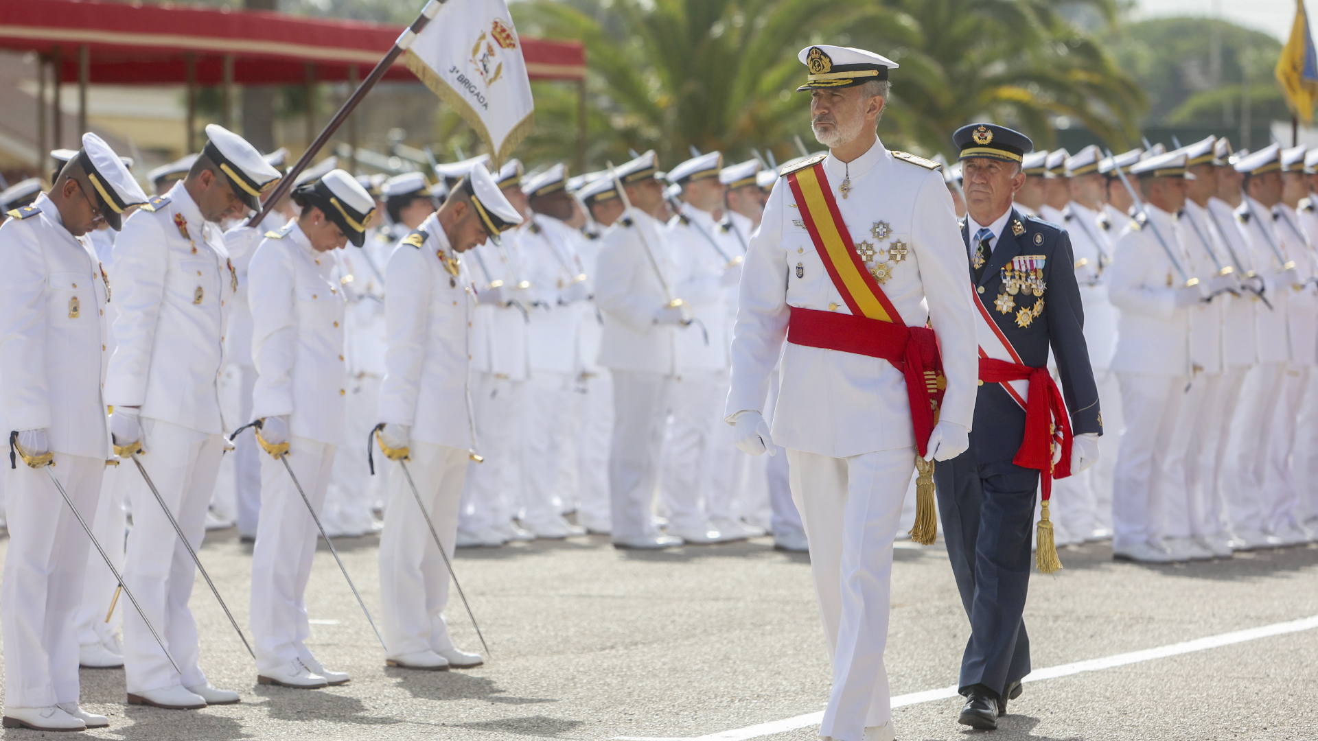 15/07/2023 00:30:48Como cada final de curso, el Rey se traslada a las Academias Militares para presidir la entrega de Reales despachos a las nuevas promociones. El lunes fue a la Academia de Suboficiales de la Armada en San Fernando, Cádiz.