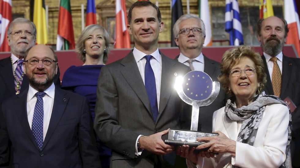 El Rey hizo entrega en Yuste del Premio Carlos V a la fundadora de las becas Erasmus, en el Dia de Europa. Acogida calurosa a los Reyes en el...