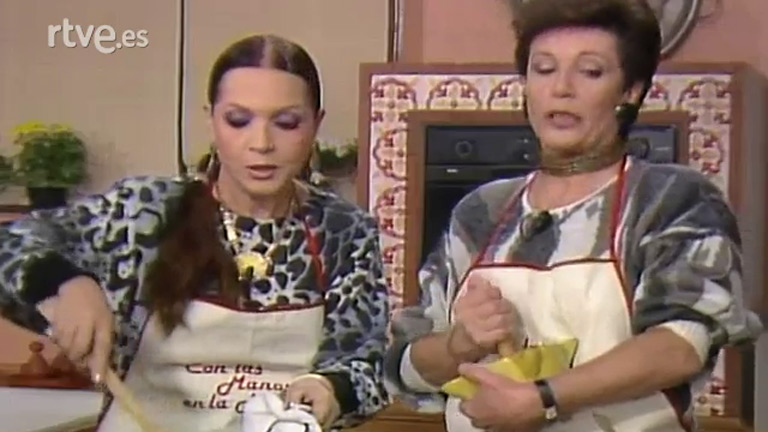 La actriz Sara Montiel cocina con Elena Santonja una de las especialidades más conocidas de la cocina manchega.