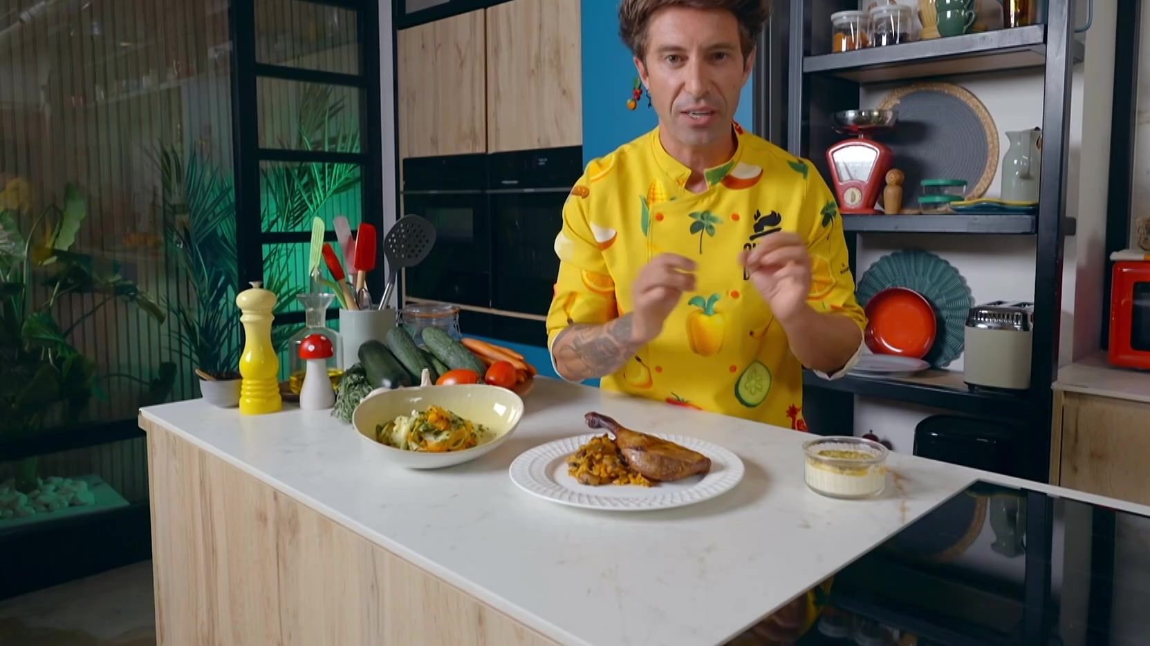 El menú del Chef Bosquet combina una amanida de làmines de verdura i herbes aromàtiques, un arròs de confit d’ànec amb aigua de coco i mousse de...