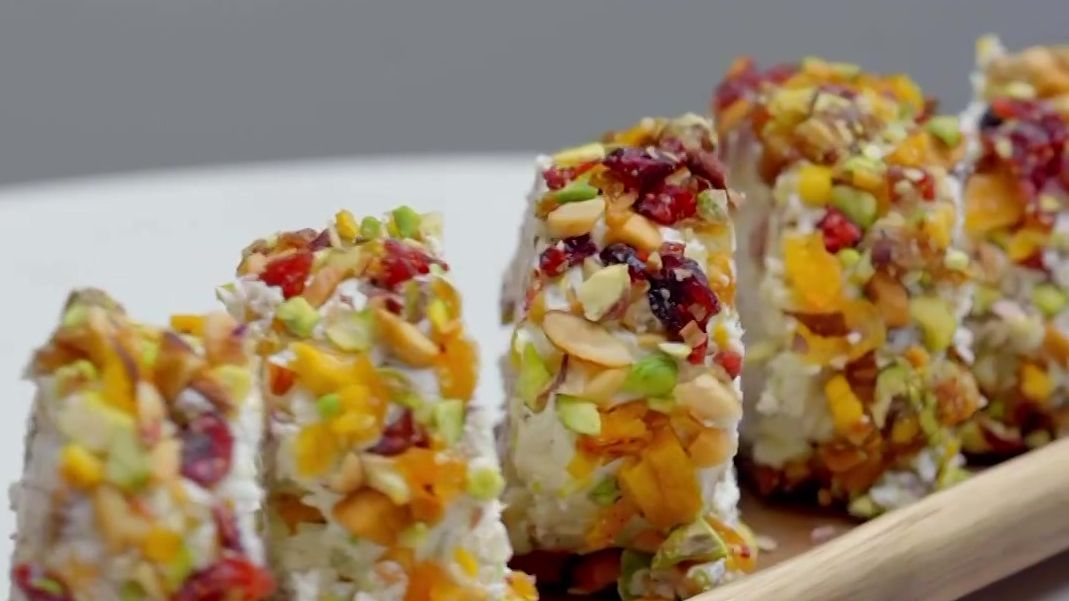 L’aperitiu de formatge crema que combina amb pistatxos, ametlles, dàtils, mango i nabius secs, tot triturat, barrejat i disposat en un cilindre.