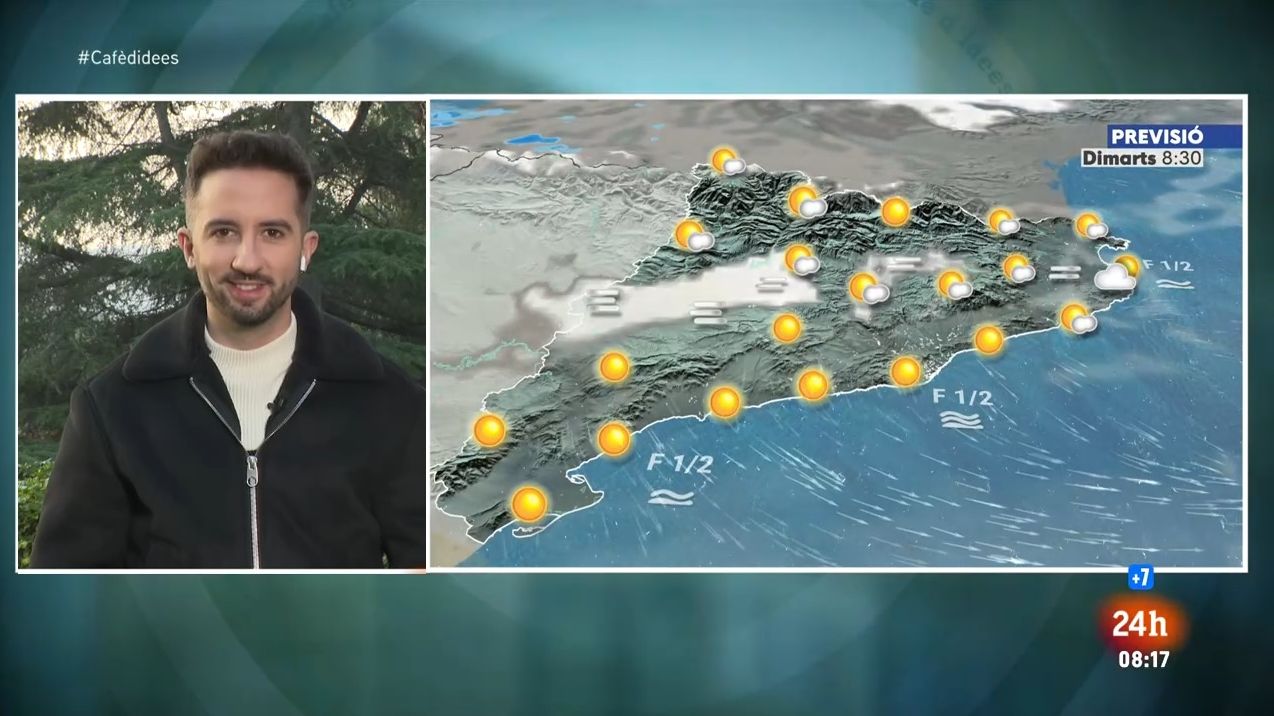 El dimarts comença amb bancs de boira extensos a l'interior que s'aniran dissipant durant el matí. Matí tranquil, estable i amb núvols alts que arriben perl nord associats al pas d'una borrasca força activa pel centre i nord d'Europa. Per tant dimarts de sol, núvols prims, boires que es trencaran, temperatura entre 2 i 5ºC més alta que ahir i entre 1 i 7ºC per sobre de la mitjana, amb valors de 15/20ºC en general i 21/22ºC al Camp de Tarragona. Alerta amb les fortes ventades aquest dimecres, dijous i divendres al centre i sud de Catalunya, cims del Pirineu i Empordà amb ratxes superiors als 70/90 km/h. Es formarà un passadís de vent generat entre l'anticicló al sud-oest peninsular i les borrasques de centreeuropa.