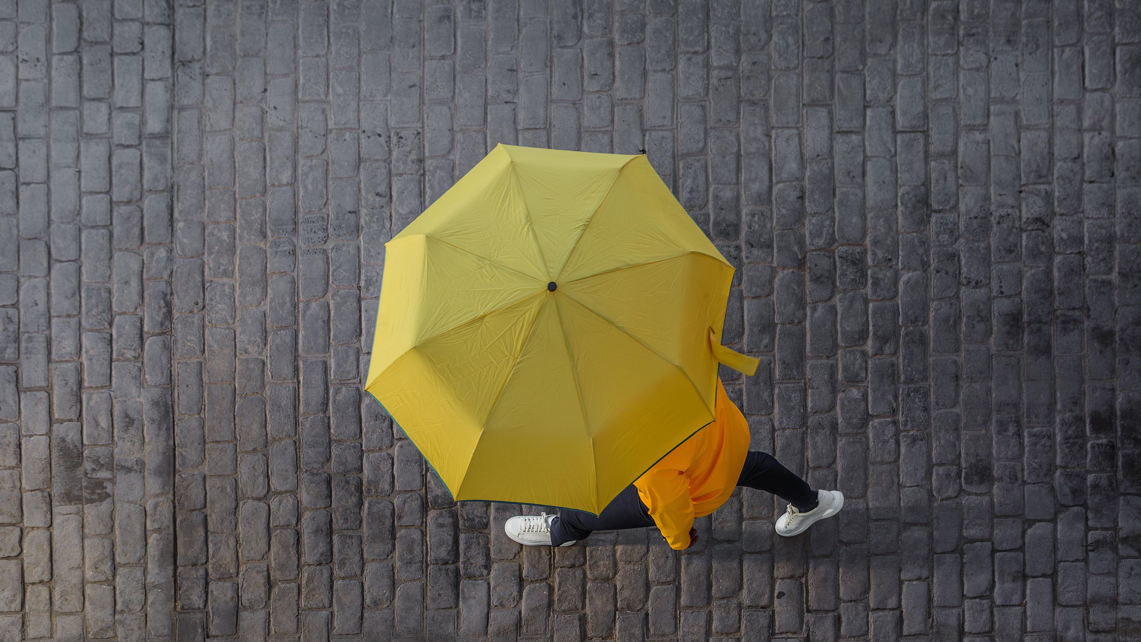 Una persona camina con un paraguas amarillo