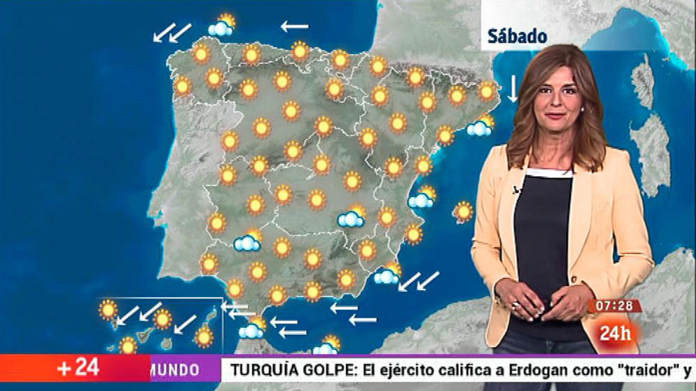 16/07/2016 00:01:07Los cielos estarán este sábado poco nubosos en casi todo el país y las temperaturas empezarán a subir de forma significativa, según el pronóstico...