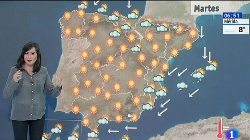 La Agencia Estatal de Meteorología (Aemet) prevé para este martes lluvias y chubascos en el área mediterránea, nubes en Canarias y sistemas montañosos del norte y temperaturas máximas sin cambios o con ascensos locales. Las precipitaciones afectarán principalmente a Baleares y Melilla y serán menos probables en el litoral sureste peninsular y área del Estrecho y también se podría producir algún chubasco en el norte de las islas Canarias. Habrá intervalos nubosos sin precipitación en el área del golfo de Vizcaya, sistema Ibérico y Pirineos y estará poco nuboso o despejado en el resto del país. Las temperaturas diurnas subirán algo en la meseta norte y cordilleras cantábrica y pirenaica y tendrán pocos cambios en las demás zonas, mientras que las nocturnas experimentarán un ligero descenso. Predominarán los vientos del este o noreste en la mayor parte de España, con intervalos de fuerte en los litorales de Galicia y toda el área mediterránea.