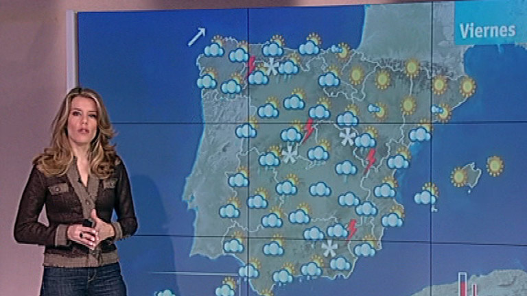 02/03/2012 00:02:07La Agencia Estatal de Meteorología (Aemet) prevé para este viernes, intervalos nubosos y probables chubascos o tormentas débiles en la mayor parte de la Península, salvo en el este de Cataluña y Baleares, donde estará poco nuboso. En Canarias, algunos intervalos nubosos, más abundantes en el norte de las islas de mayor relieve. La cota de nieve en la Península estará entre los 1.500 y 2.000 metros. Posibilidad de algún banco de niebla en el interior peninsular. Las temperaturas diurnas en general en ligero a moderado descenso en la Península, que podría ser notable en zonas del cuadrante sureste, y sin cambios en Baleares y Canarias. Las nocturnas con pocos cambios. Viento flojo variable al principio en la Península y Baleares, tendiendo a ser flojo a moderado del suroeste a lo largo del día. En Canarias, moderado del noreste con algún intervalo de fuerte.