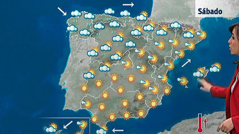 Un nuevo frente entrará el sábado por el tercio noroeste peninsular que dejará lluvias, y ocasionalmente tormentas, en Galicia, Cantábrico y noroeste de Castilla y León, que podrían extenderse de forma dispersa por la mitad norte de la Península, sistema central, Alto Ebro y Pirineos. La entrada del frente mantendrá en situación de alerta amarilla (riesgo) por lluvias y fenómenos costeros a La Coruña y Pontevedra. Vizcaya, Asturias y Cantabria estarán también en alerta por fuerte oleaje, según informa la Agencia Estatal de Meteorología (Aemet). En el resto del país, los cielos estarán poco nubosos en el centro, área de Levante, sur peninsular y Baleares. En Canarias, habrá intervalos nubosos en el norte de las islas.