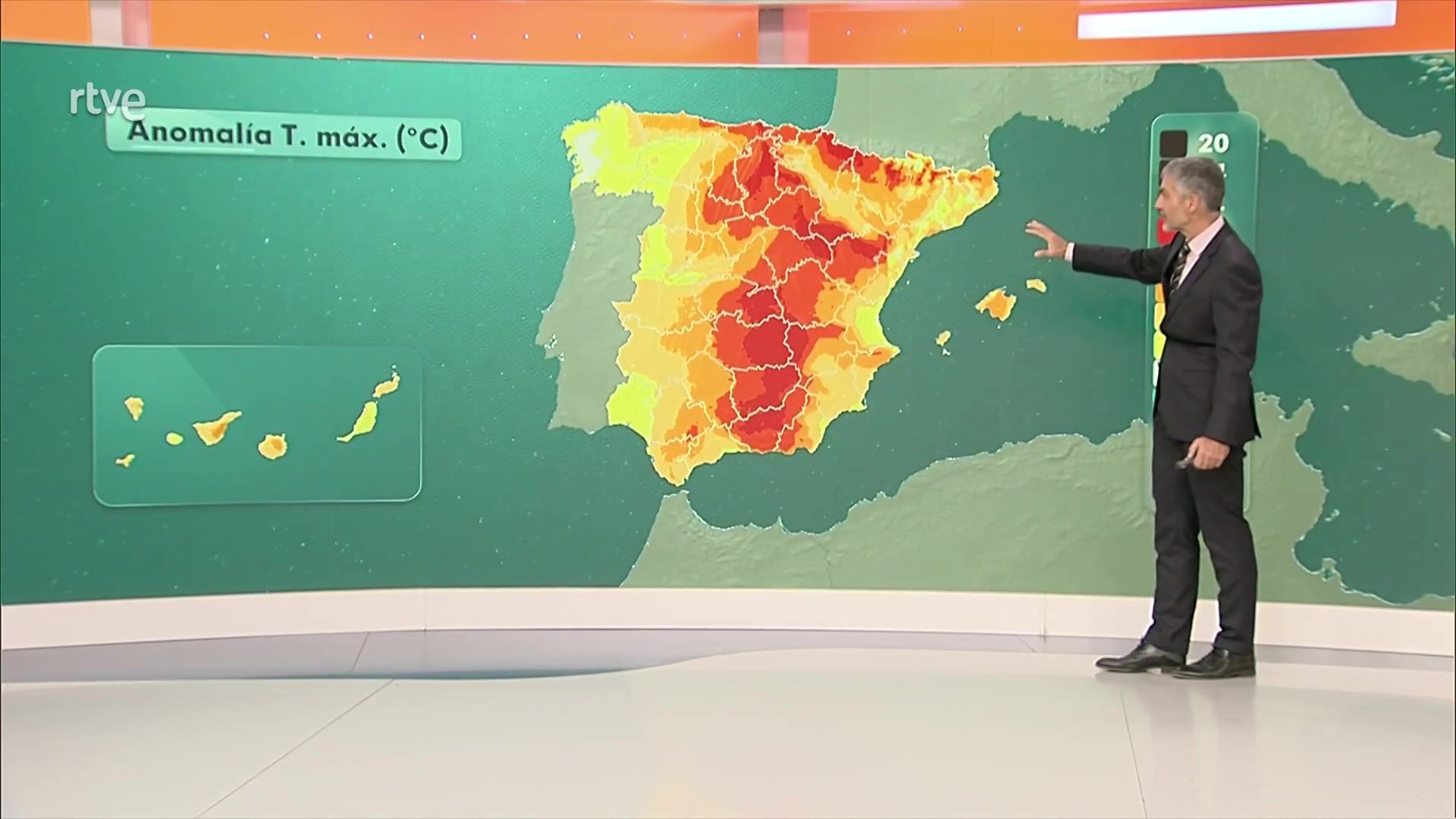 Temperaturas máximas en ascenso en general excepto puntuales descensos en zonas del sistema Central y puntos de la fachada oriental, y pocos cambios en las islas. Predominio de ascensos de las mínimas en la Península y Baleares, si bien con ligeros descensos en puntos de la vertiente mediterránea al igual que en Canarias. Heladas localmente moderadas en Pirineos.