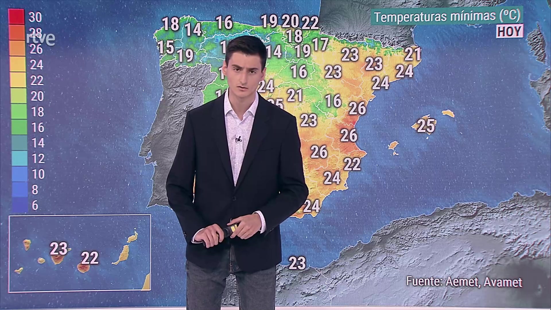 Las temperaturas diurnas descienden en las vertientes atlántica y cantábrica, más acusadamente en la mitad norte, y de forma notable en el alto Ebro, País Vasco y Navarra. En ascenso en el área mediterránea y en Canarias. Las máximas todavía superarán los 36/38 grados en buena parte del sur, centro y este peninsulares, y en Baleares. Es probable que se sobrepasen los 38/40 grados en los ríos de la vertiente atlántica sur, interior sudeste, medio Ebro y, localmente, en los archipiélagos, incluso los 42/44 en los valles del Guadalquivir y del Segura. Asimismo, en el interior sudoeste, litoral sudeste y Baleares las nocturnas no bajarán de 24 grados.