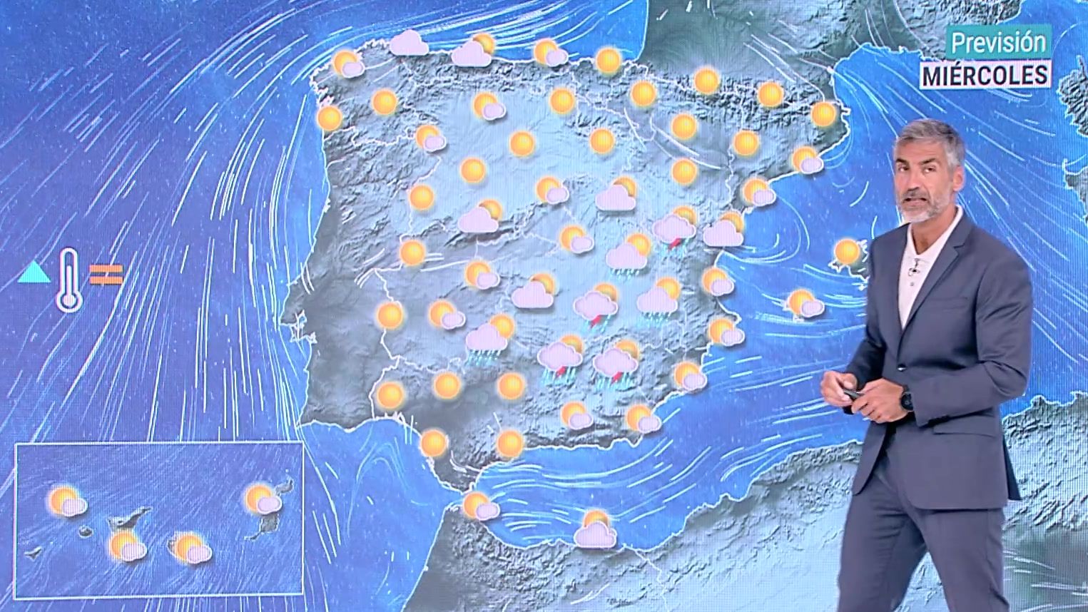 21/08/2024 00:09:02En la mayor parte del país se prevé tiempo estable con cielos poco nubosos o despejados En el norte de Galicia y área cantábrica se prevén intervalos nubosos con precipitaciones débiles ocasionales tendiendo a menos a lo largo del día. Asimismo se darán intervalos de nubes bajas matinales en áreas aledañas al sur, así como en Valencia, Estrecho, Alborán, con probables bancos de niebla matinales y, en el este de Cataluña, sin descartar chubascos aislados. Por la tarde se desarrollará nubosidad de evolución en Castilla-La Mancha, Extremadura y provincias colindantes, así como en Andalucía interior y este de Cataluña, con posibles chubascos y tormentas ocasionales, más probables e intensos en el interior este y sudeste. Las tormentas y chubascos serán localmente fuertes y acompañadas de granizo en la Ibérica oriental y en el sur de Castilla La Mancha y norte de Andalucía. En Canarias se esperan intervalos de nubes medias y altas terminando de recorrer el oeste del archipiélago de este a oeste, sin descartar algún chubasco y tendiendo en general a poco nuboso. Aún podría persistir calima débil en Canarias y en Melilla.