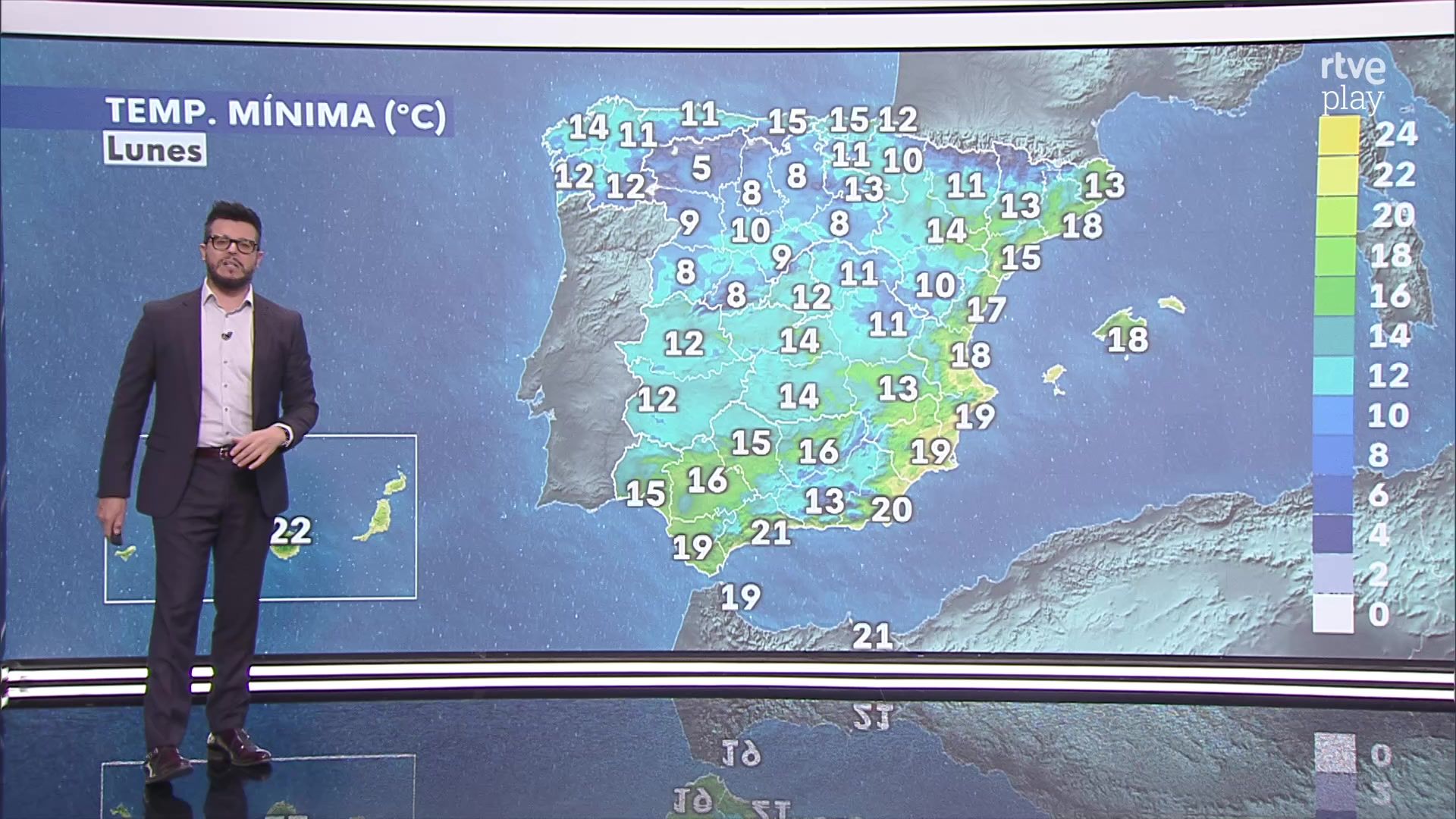 Temperaturas máximas en descenso en el entorno cantábrico oriental y norte de Baleares, con aumentos en el este peninsular, y sin grandes cambios en el resto. Mínimas en descenso, con pocos cambios en Canarias.