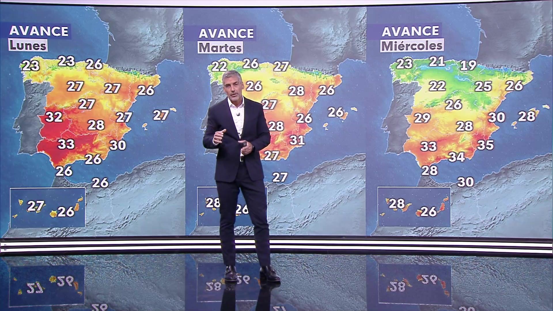 Las temperaturas máximas continúan en descenso en la mitad oriental peninsular y Baleares, localmente notable en zonas del litoral mediterráneo mientras que comienzan a aumentar por el oeste. Las mínimas en descenso generalizado. En Canarias no se esperan grandes cambios. Se esperan heladas débiles en Pirineos y, aisladamente, en cumbres de la cordillera Cantábrica occidental, Ibérica norte y sistema Central.