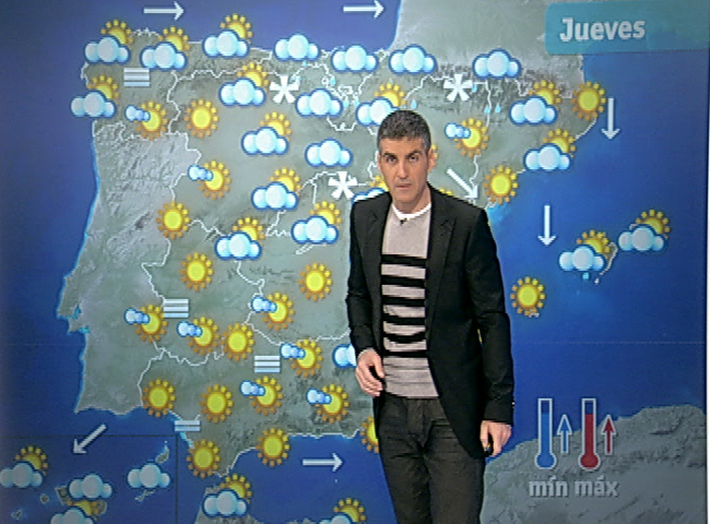 16/03/2011 00:12:36La Agencia Estatal de Meteorología (Aemet) prevé para mañana, jueves, precipitaciones en forma de nieve por encima de los 1.500 metros en el norte y centro peninsular, tendiendo a remitir, e intervalos de viento fuerte en el Cantábrico oriental, valle del Ebro y Alborán. En casi todo el resto de la Península, cielos nubosos o con intervalos nubosos, con posibilidad de lluvia débil en el resto del extremo norte y puntos del interior peninsular, y en el área mediterránea peninsular intervalos nubosos tendiendo a poco nuboso. En las Islas Baleares, nuboso con chubascos débiles, más probables en el norte y en las Islas Canarias, nuboso con posibilidad de lluvias débiles en el norte. Las temperaturas diurnas en ligero o moderado ascenso en la Península, y en el resto, pocos cambios. El viento soplará en la Península y Baleares flojo o moderado de oeste y noroeste, con intervalos de fuerte en el Cantábrico oriental, noreste peninsular y Alborán; en las Canarias, viento del noreste de flojo a moderado.