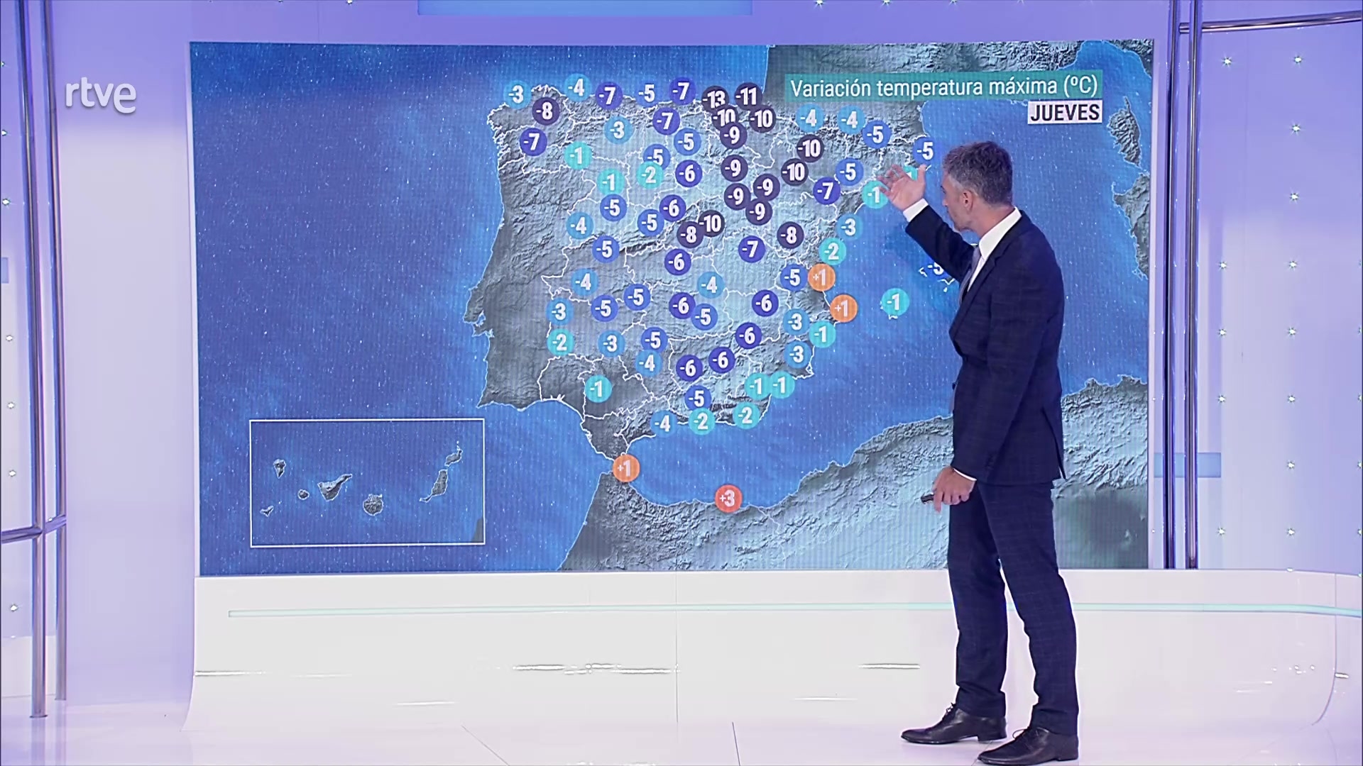 Viento de componente norte en Canarias y litoral de Galicia, de poniente en el litoral de Alborán, de componente este en el resto del área mediterránea y de componente sur en buena parte del interior peninsular.