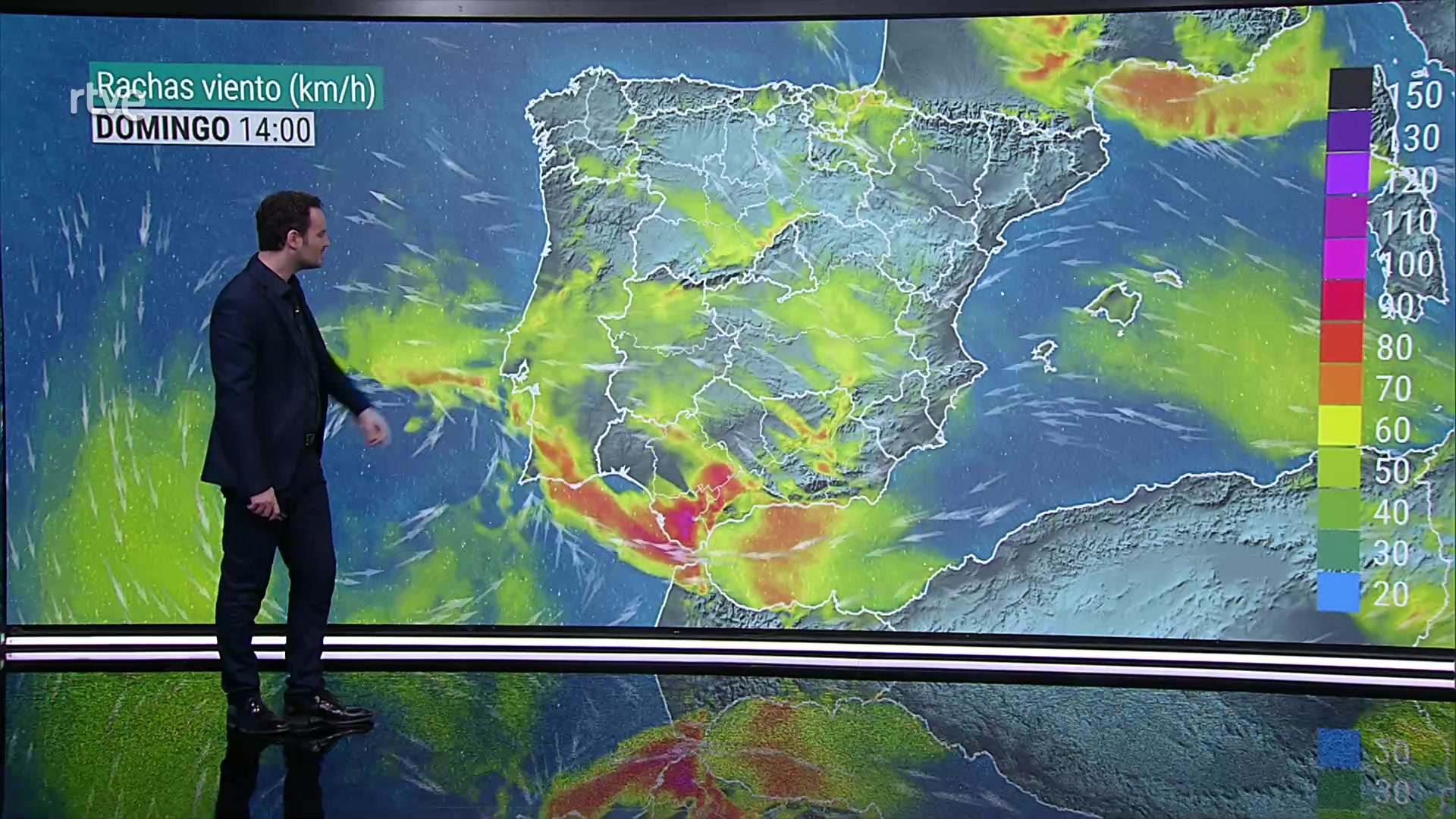 Intervalos de viento fuerte del este en Alborán y el Ampurdán y del noreste en el resto del área mediterránea, con levante fuerte al final en el Estrecho. Viento del noreste en el interior de Valencia y Murcia y del este o sureste en el resto de la Península. Nordeste rolando a noroeste en Canarias.