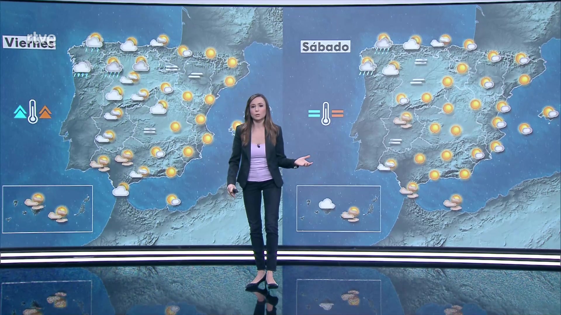 Las temperaturas máximas descenderán en Baleares, permanecerán con pocos cambios en áreas mediterráneas peninsulares, y aumentarán de forma generalizada en el resto, de forma más acusada en las islas Canarias orientales y en montañas de la mitad norte peninsular. Las mínimas en general no experimentarán grandes cambios, predominando los aumentos en el Cantábrico y Pirineos y los descensos en el resto. Heladas débiles en montañas de la mitad norte peninsular, sin descartar localmente en la meseta Norte.