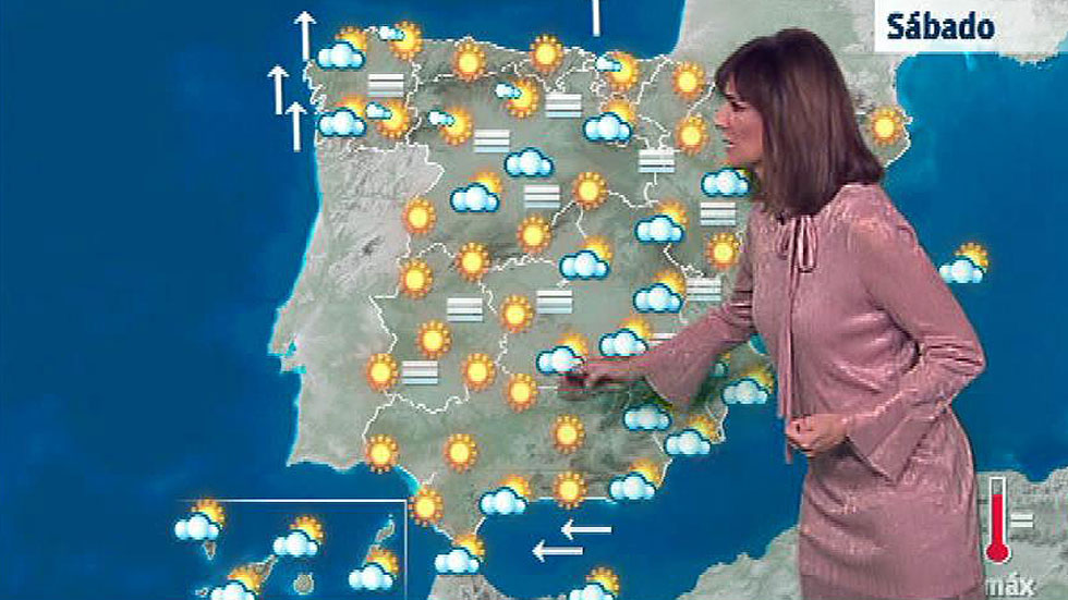 La Agencia de Estatal de Meteorología (Aemet) prevé para este sábado temperaturas con pocos cambios, nieblas localmente persistentes en la meseta norte y cuenca del Ebro, y poco nuboso con algunos intervalos de nubes altas en el resto del país. Intervalos nubosos en la mitad sur del litoral mediterráneo peninsular y en Ibiza, con posibilidad de alguna precipitación débil, sobre todo de madrugada. Intervalos nubosos al principio en el resto del cuadrante sureste peninsular y resto de Baleares, con tendencia a poco nuboso a lo largo del día, y también en la mitad oeste de Galicia, y por nieblas en la meseta norte y cuenca del Ebro. Nieblas localmente persistentes en la meseta norte y cuenca del Ebro, y posibilidad también de algunas menos extensas y duraderas en la meseta sur. Temperaturas con pocos cambios y viento de componente sur en Galicia, alto Ebro, Cantábrico oriental y este de Canarias; de componente este en el litoral andaluz, con levante moderado en el Estrecho y flojo variable o en calma en el resto.
