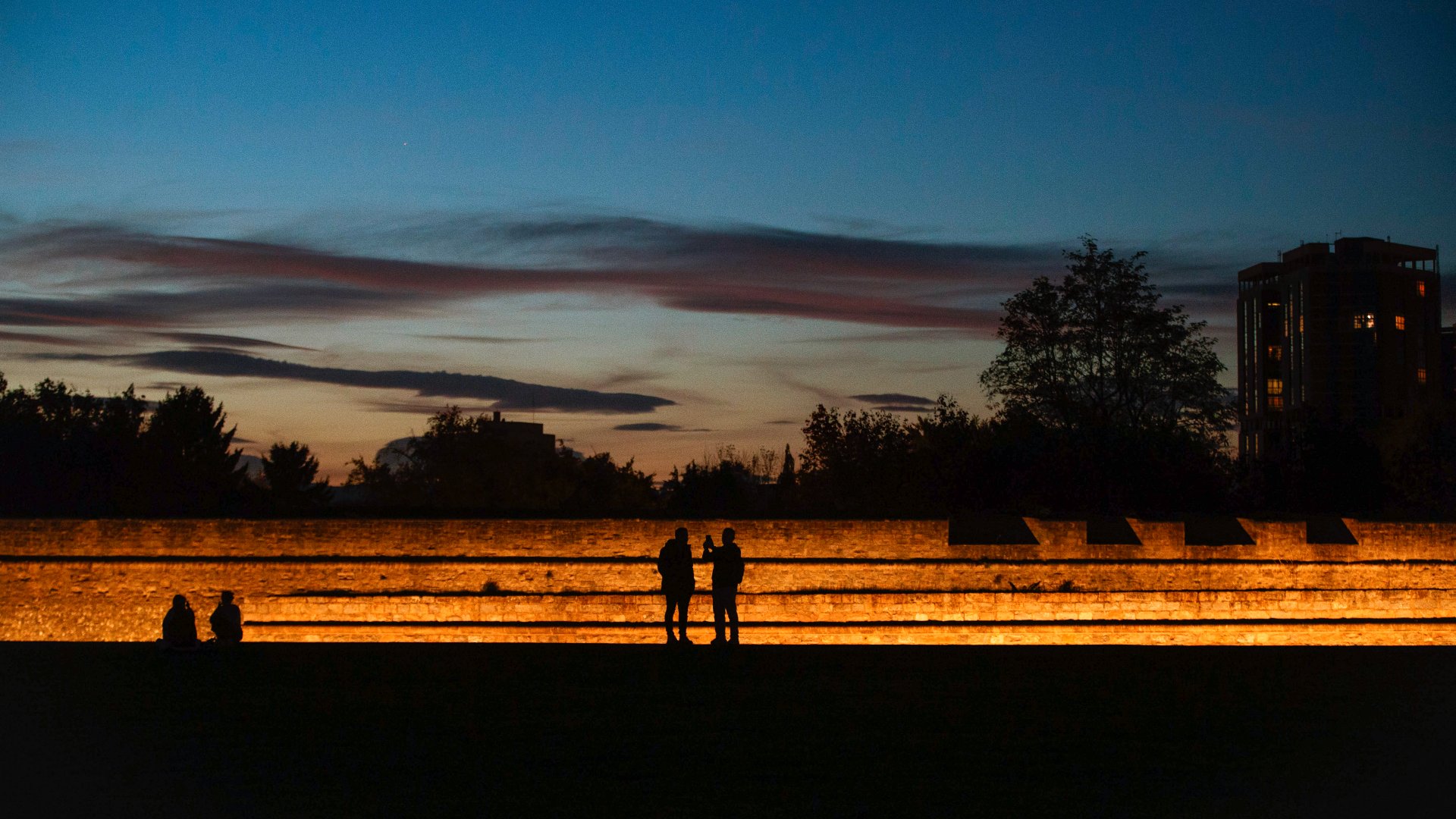 Foto: Varios jóvenes acuden a la Vuelta del Castillo de Pamplona para ver el atardecer de la capital navarra. EFE/Villar López