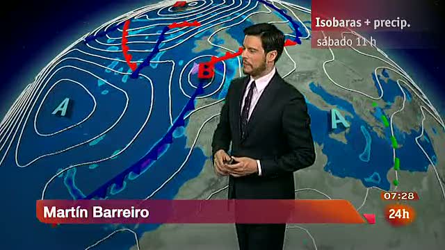 24/11/2012 00:01:12La Agencia Estatal de Meteorología (Aemet) prevé para este sábado viento muy fuerte en Galicia y área cantábrica, y viento fuerte en la Meseta norte, alto Ebro y Ampurdán. Habrá cielo muy nuboso en el tercio occidental peninsular con lluvias débiles a moderadas que se podrían extender a otras zonas de la mitad oeste y en el resto de la Península se esperan intervalos nubosos con nubes medias y altas. En las Islas Canarias poco nuboso, aunque aumentando al final del día a nuboso en la isla de La Palma, con probables lluvias débiles o moderadas. Las temperaturas en ligero a moderado ascenso en Galicia, Cantábrico y las Canarias; las nocturnas en ligero a moderado ascenso en la mayor parte de la Península y la cota de nieve bajando hasta los 1.800/2.000 metros en el noroeste peninsular.