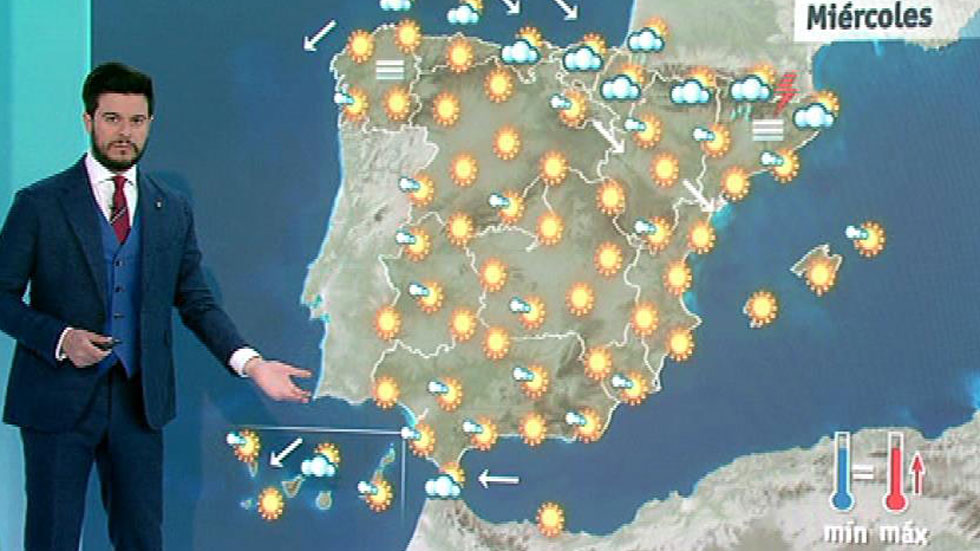 La Agencia Estatal de Meteorología (Aemet) prevé para este miércoles cielos nubosos en el País Vasco, norte de Navarra, Pirineos, norte de Cataluña y Menorca. No se descartan algunas precipitaciones débiles y dispersas en Guipúzcoa, noroeste de Navarra, que pueden ser más intensas y acompañadas de tormenta en Gerona y en el Pirineo catalán. Intervalos nubosos en el resto del Cantábrico, en el alto Ebro y, al principio del día, en el Estrecho, Melilla y en el norte de las islas Canarias de más relieve. Poco nuboso o despejado en el resto del país. Las temperaturas diurnas estarán en ascenso en Canarias y en gran parte de la Península, salvo en el noroeste y en el litoral mediterráneo, y con pocos cambios en Baleares y en las nocturnas. Vientos de componente norte en el extremo norte peninsular, Valle del Ebro, Canarias y oeste de Baleares, de componente sur en el litoral levantino y del este en el litoral de Alborán con intervalos de fuerte en el valle del Ebro y en el Estrecho. Flojo en el resto.
