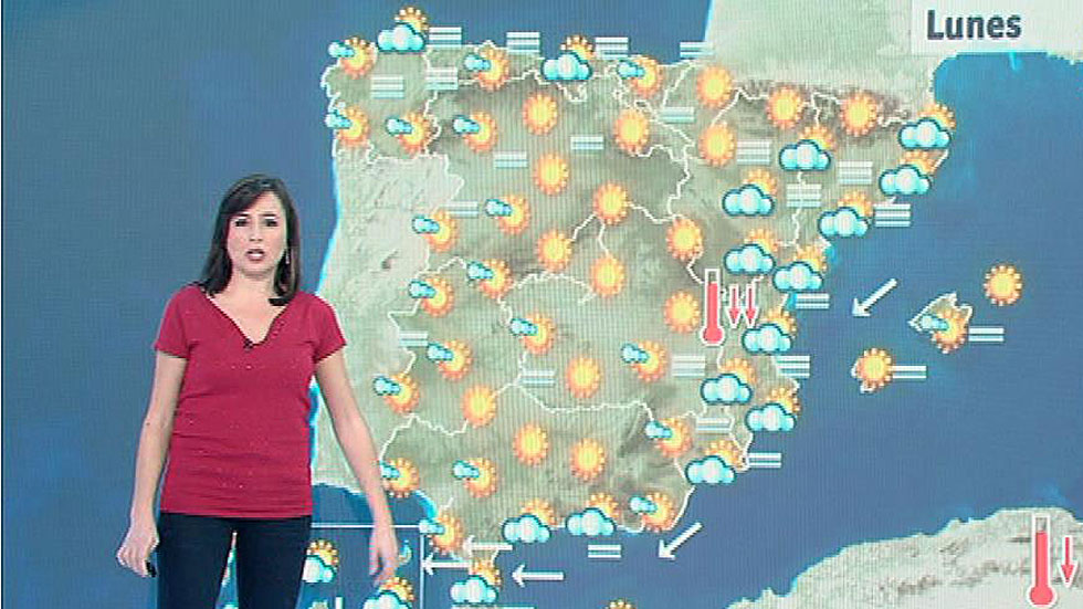 Temperaturas diurnas en descenso en el interior del tercio oriental peninsular. Viento de Levante en el Estrecho, con intervalos de intensidad fuerte y componente este en el litoral andaluz; flojos de dirección variable en general en el resto, con predominio de componente este en el cuadrante suroeste, Menorca y Bajo Ebro, y componente sur con algunas rachas en Navarra.