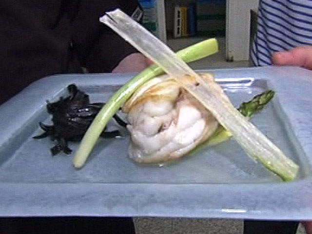 Ingredientes:225 g. rape35 g. ajo1 puerroEspárragos triguerosAjetes200 g. azúcar50 g. tallarines de sepiaNataAguaAceite de olivaSalRestaurante del...