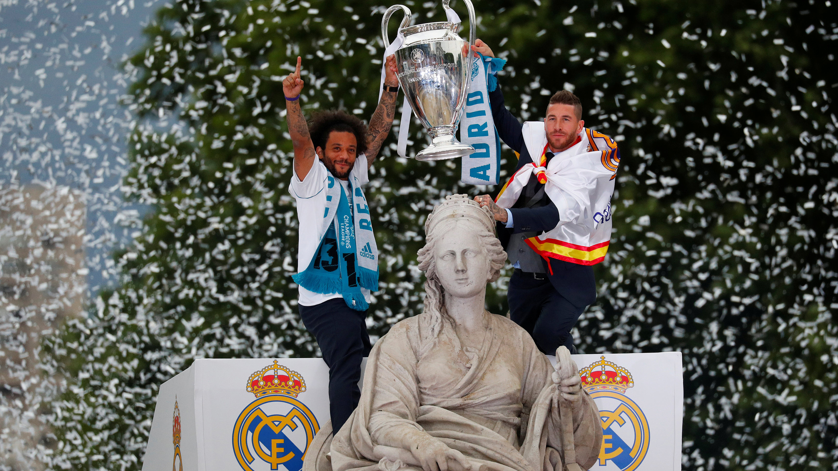 Los jugadores del Real Madrid han celebrado la consecución de la 13ª Champions de su equipo en la estatua de Cibeles, tradicional lugar de festejo...