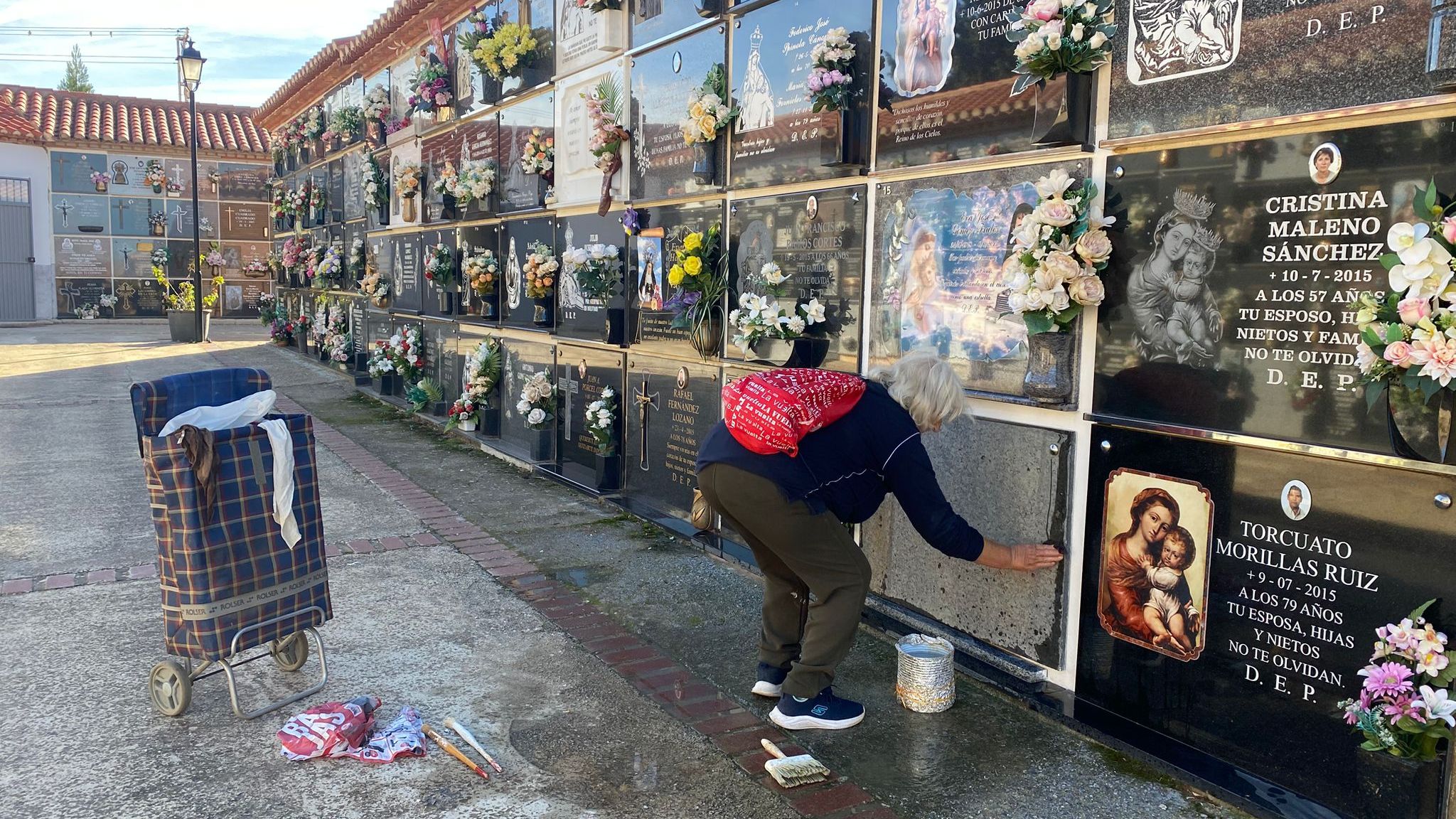 Una mujer limpia una lápida en el Cementerio Municipal San José de Guadix.