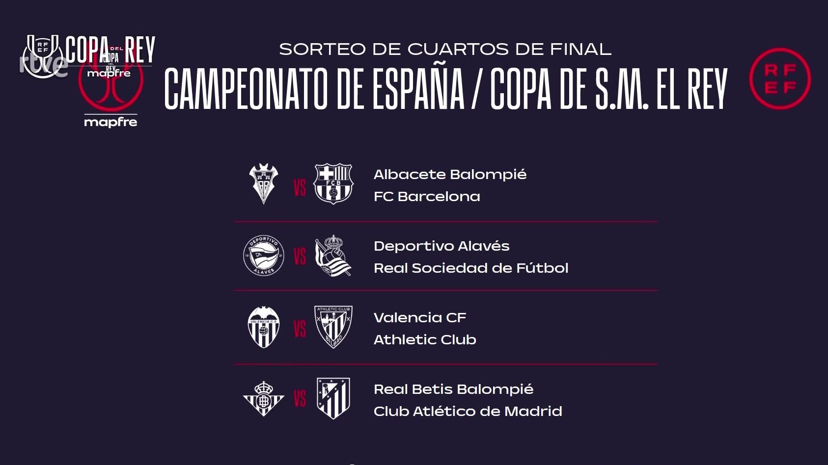 Albacete-Barça, Alavés-Real Sociedad, Valencia-Athletic y Betis-Atlético; emparejamientos de cuartos de final de la Copa