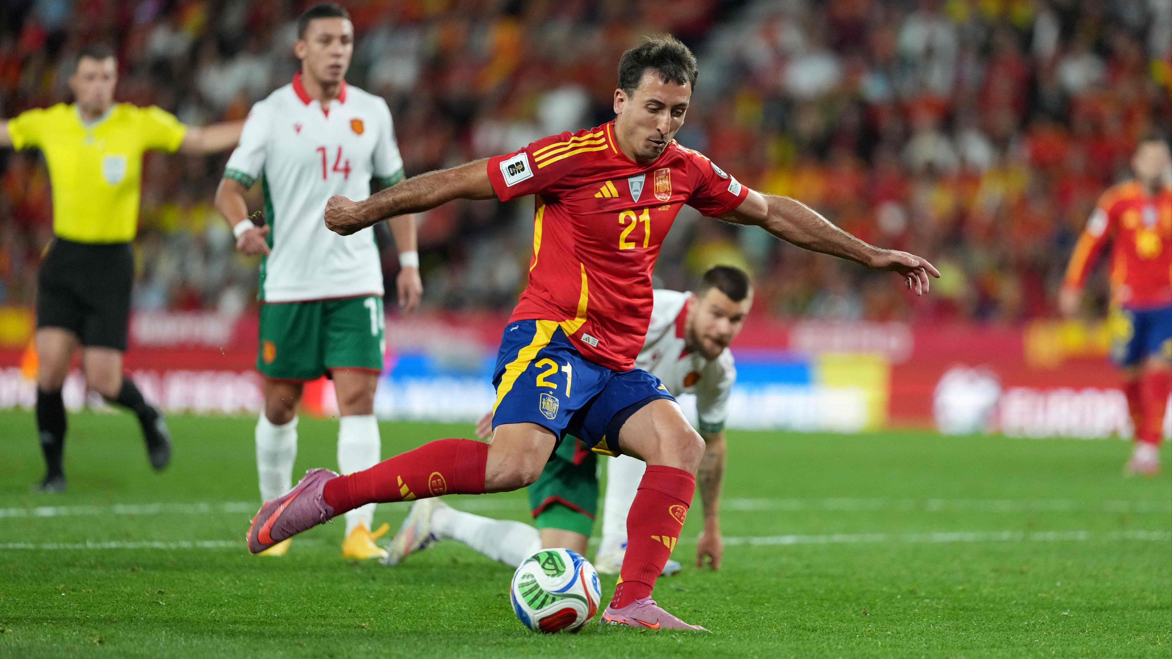 Oyarzabal ha marcado desde el punto de penalti el 4-0 ante Bulgaria con el minuto 90 ya cumplido. Mikel Merino fue derribado de manera clara dentro...