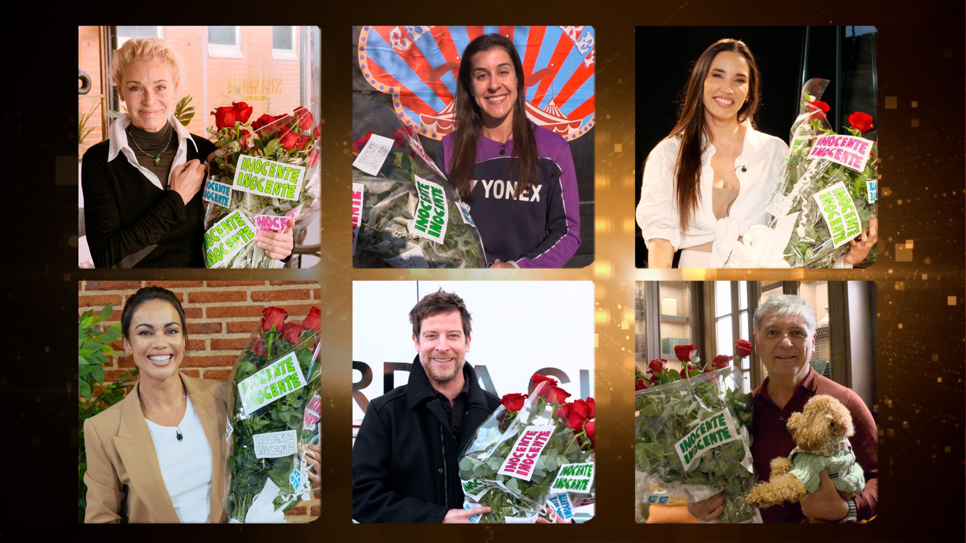 Las nuevas “víctimas” de las divertidas bromas de este año de la Gala ‘Inocente, Inocente’ son la campeona olímpica Carolina Marín, la presentadora Lara Álvarez, la actriz Belén Rueda, el entrenador de tenis Toni Nadal, la cantante India Martínez y el actor Manu Baqueiro.