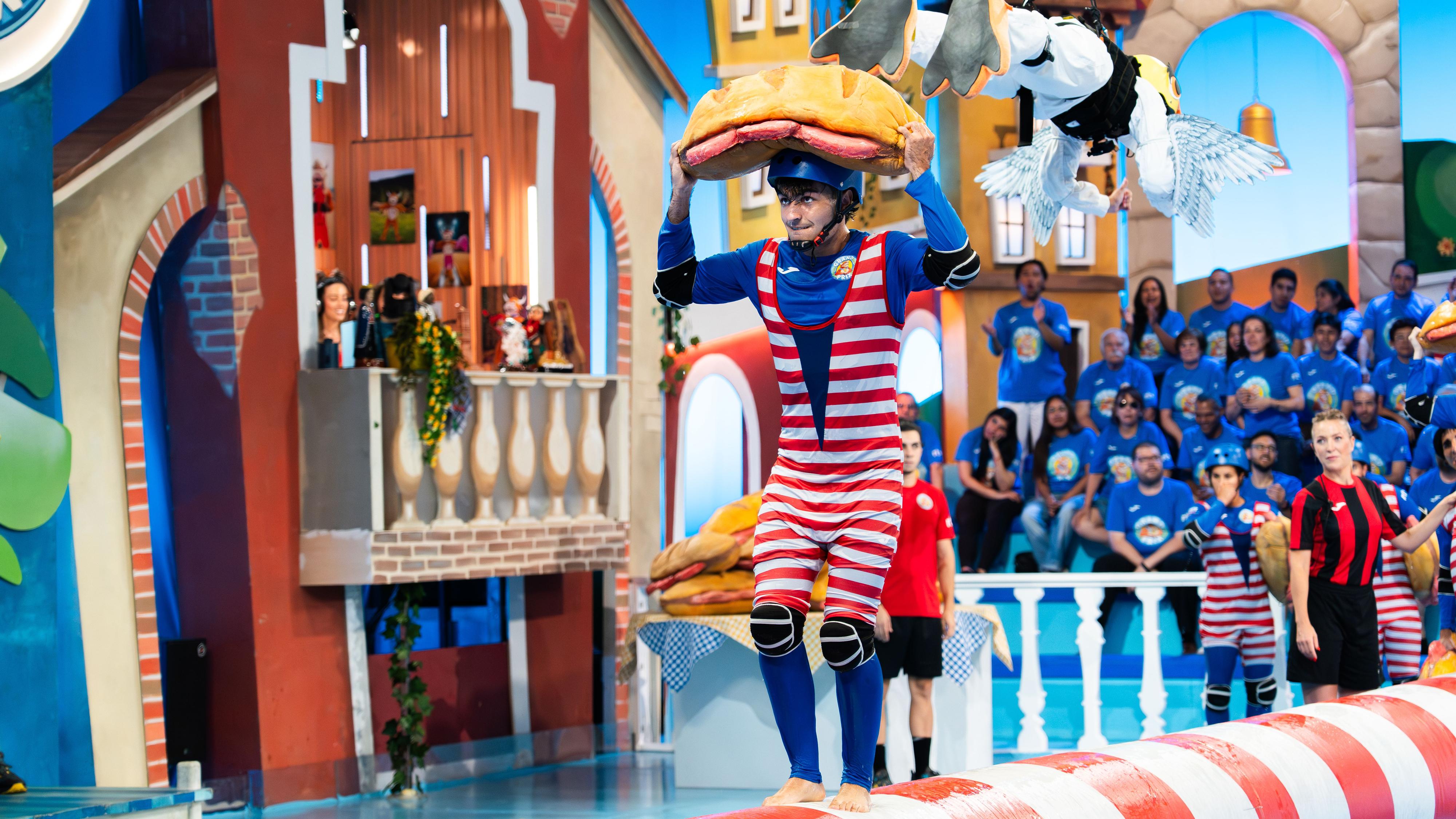 Concursante de Urduliz en el momento que cruza la piscina con un bocata sobre la cabeza