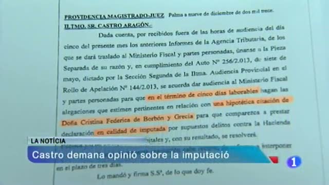 09/12/2013 00:02:02El jutge Castro fa una passa més en la instrucció del cas Noos i demana opinió a les parts sobre la imputació de la infanta Cristina. El jutge els demana si creuen que ha de citar la infanta perquè declari com a imputada pels presumptes delictes de frau fiscal i blanqueig de capitals.