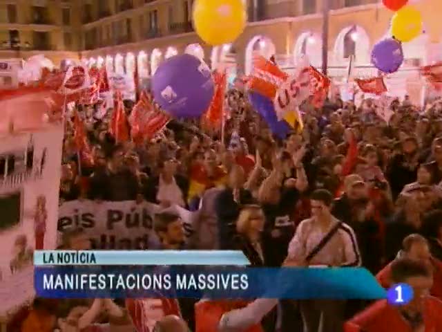 30/03/2012 00:01:42Devers 75 mil persones, segons els sindicats, i més de 25 mil, segons la Policia, es varen manifestar ahir capvespre pels carrers de les capitals de les Illes contra la reforma laboral que impulsa el Govern central.