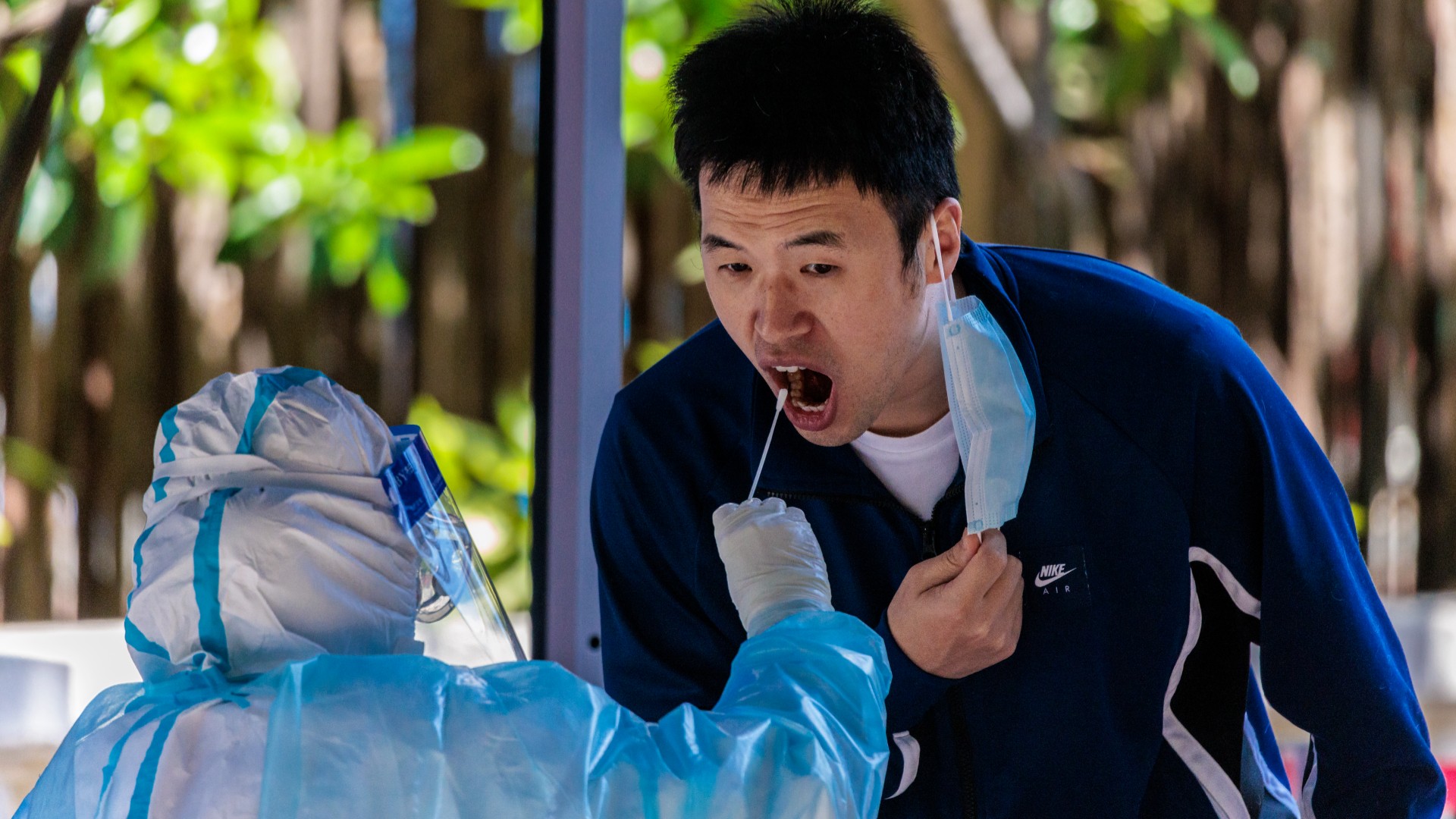 FOTO: Un sanitario realiza una prueba de COVID a un hombre en un distrito confinado de Shanghái, en China. EFE/EPA/ALEX PLAVEVSK.