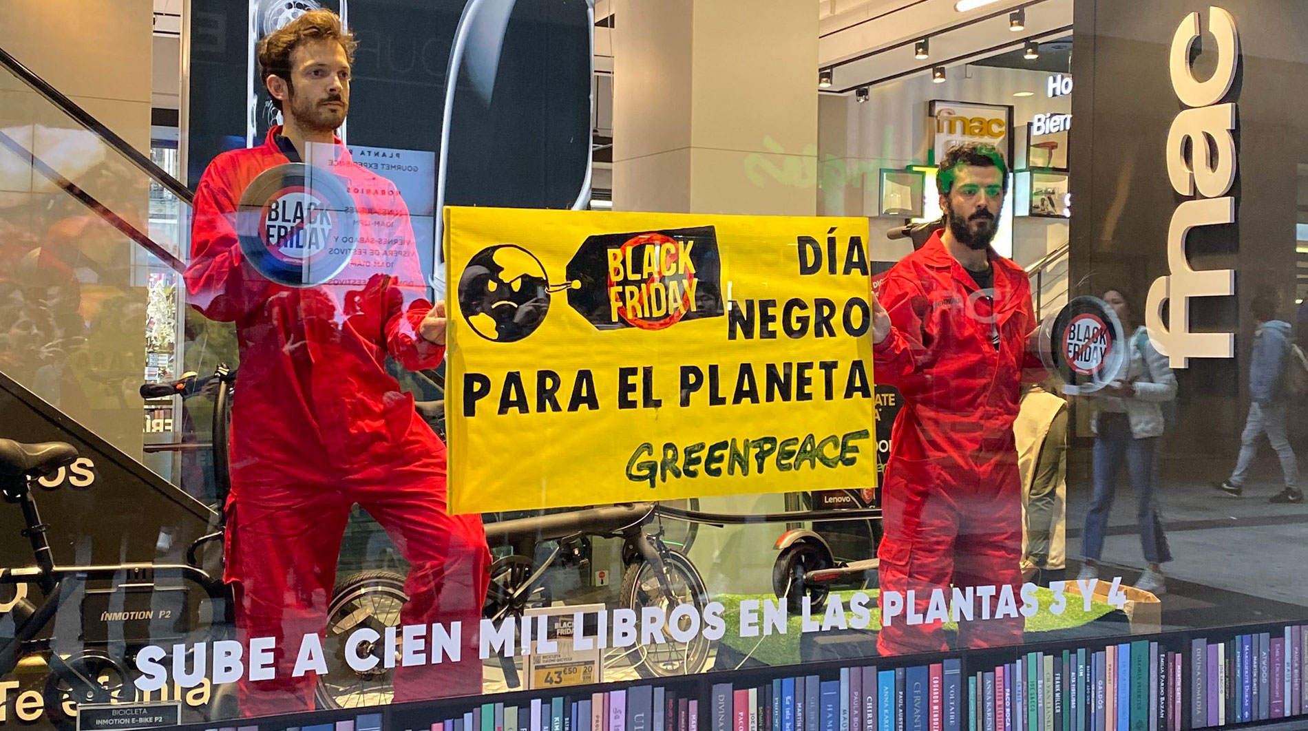La acción de Greenpeace continúa con varios de sus activistas ocupando los escaparates de distintos comercios (Primark, Mango, Nike, Fnac, Zara, El...