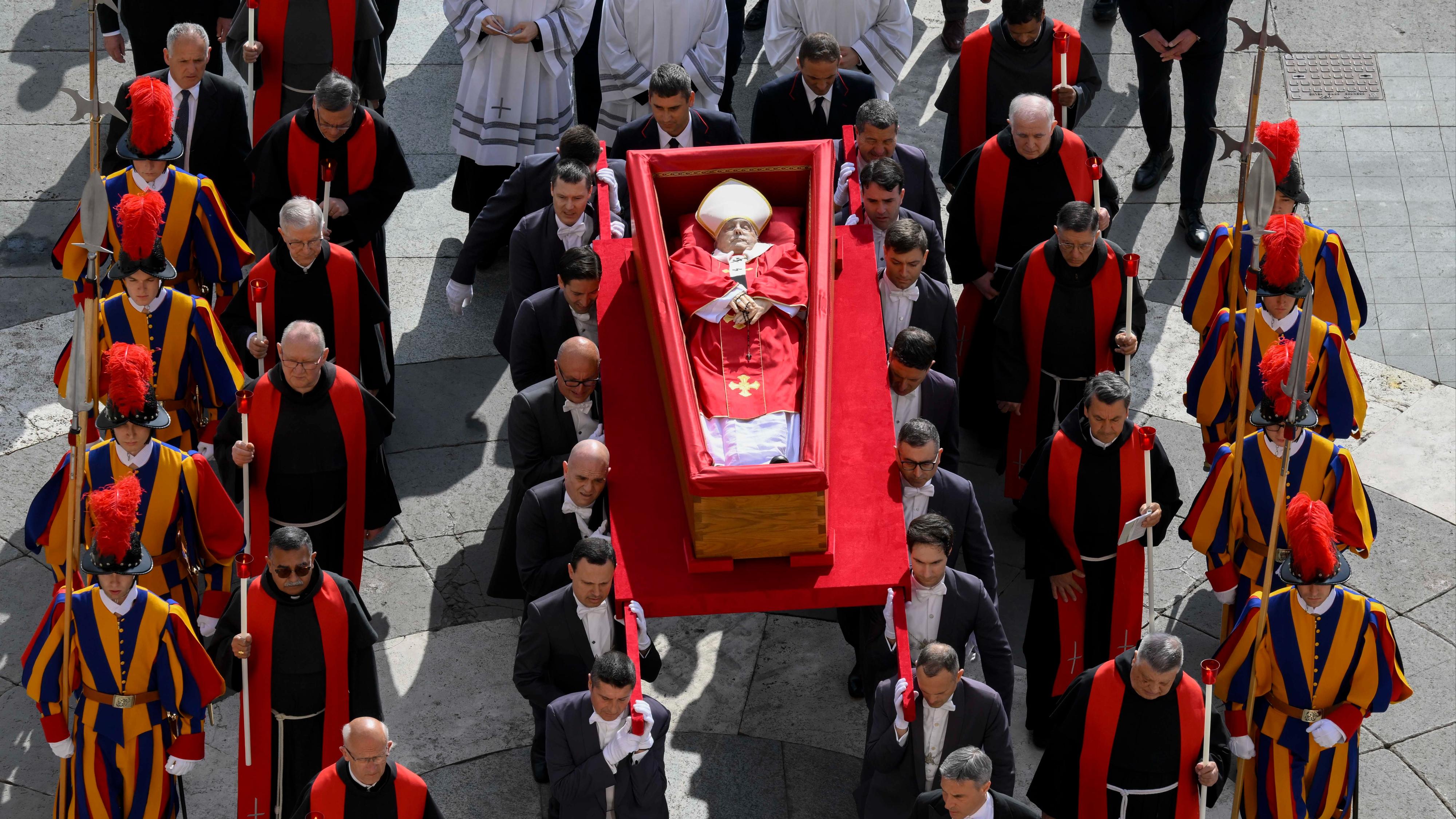 Durante el recorrido por la Plaza de San Pedro se han podido escuchar aplausos que salían de entre los fieles congregados para despedir al papa. El sencillo féretro de madera de Francisco se ha ubicado a nivel casi del suelo, sobre una pequeña plataforma, en el altar de la Confesión, y ha sido bendecido con agua bendita. El cardenal camarlengo, Kevin Joseph Farrell, ha presidido la Liturgia de la Palabra. A las 11:00 horas se ha abierto la capilla ardiente para que sea visitada por los fieles.