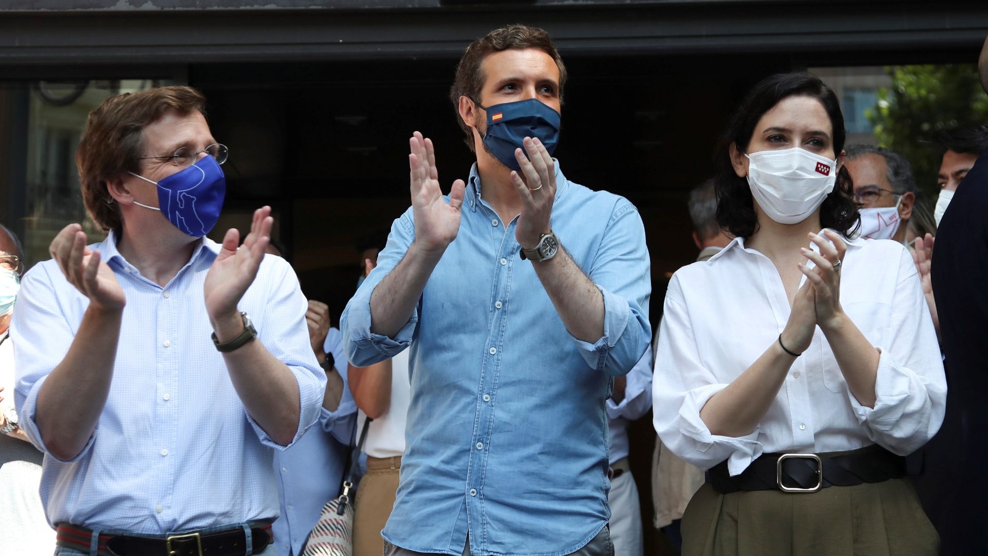 FOTO: Pablo Casado, junto a Isabel Díaz Ayuso y José Luis Martínez-Almeida, hace declaraciones en la puerta de la sede nacional del partido. EFE/David Fernández
