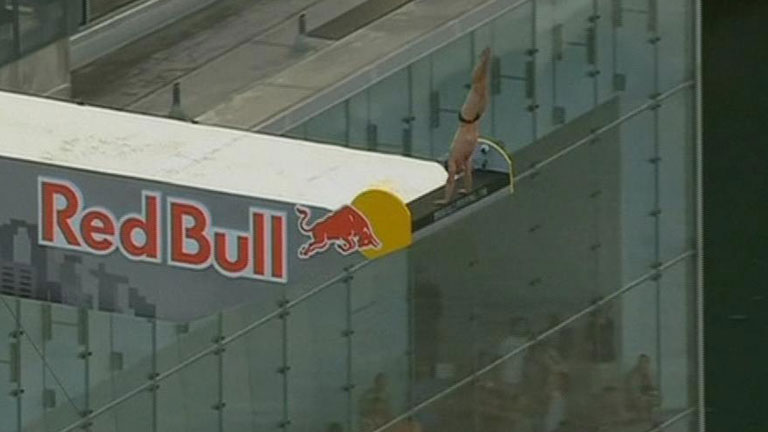 Catorce saltadores de trampolín se han lanzado desde 27,5 metros de altura en Boston. Dado el peligro de la prueba hay cinco socorristas esperando...