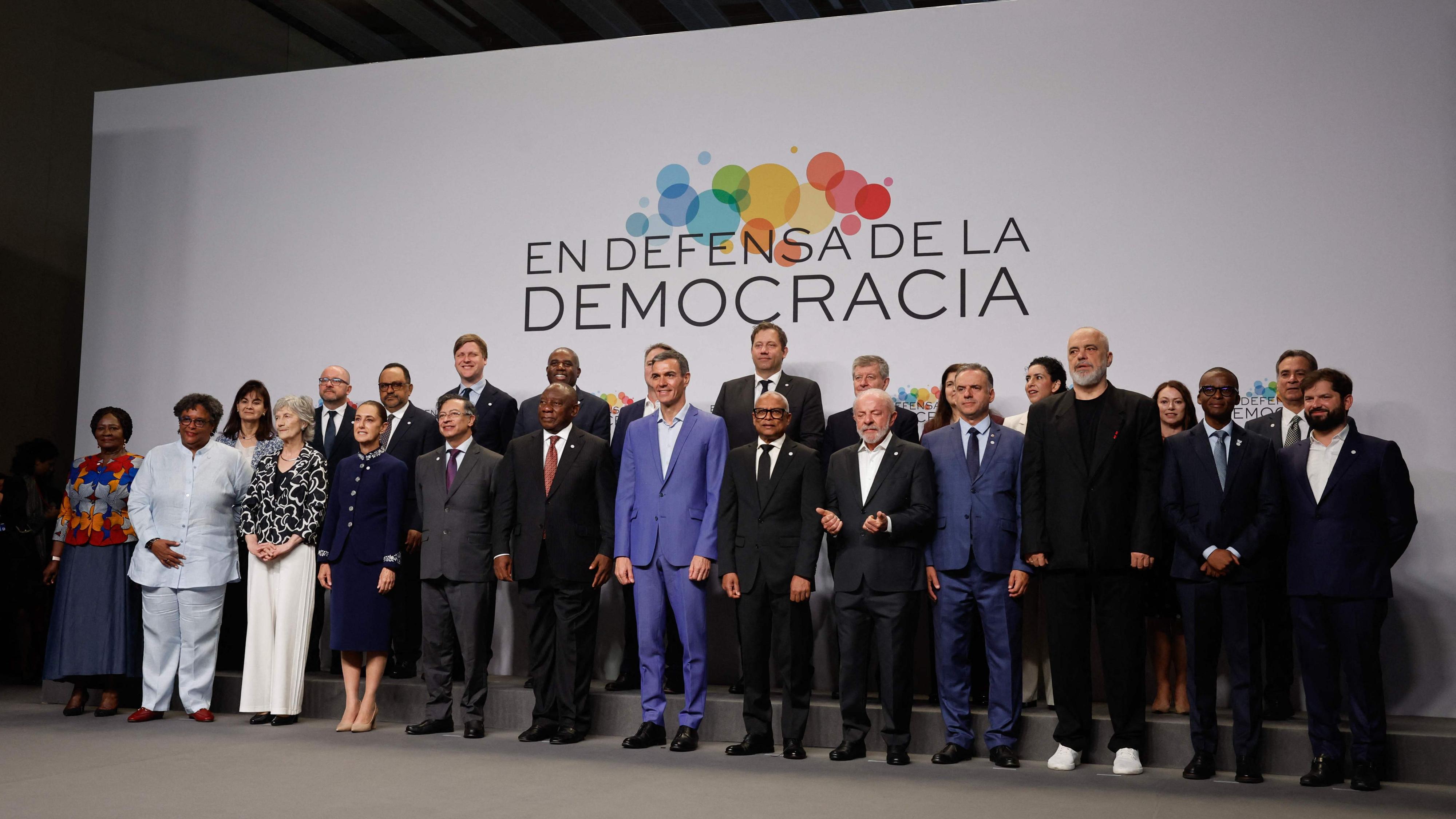 El presidente del Gobierno, Pedro Sánchez, posa junto a sus homólogos de varios países en la IV Reunión en Defensa de la Democracia, que se celebra...